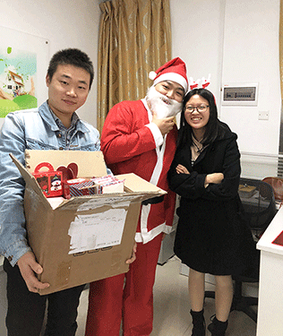 推開門走進來,辦公室正放著悠揚的音樂Merry Christmas,緩緩流淌的祝福溢滿了歸人的夢境。辦公區(qū)域,慈祥的圣誕老人微笑著拿著禮物等待上班的人兒,給他們帶來一天的喜悅和祝福。