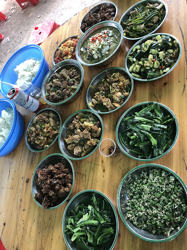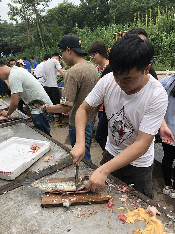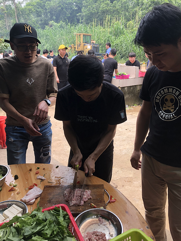 中午時分,便是野炊。所有團(tuán)隊(duì)人員,爭先搶著擇菜,洗菜,切菜,個個上心,心靈手巧,神情專注,像柔指在琴弦上滑動,在琴鍵上跳動,那些菜在他們手上簡直就是蝴蝶、蜻蜓、花朵,一劃一撥,簡直是在寫詩。如此曼妙,此景只有人間樂,誰聞天堂有此景。做菜烹調(diào)是難事,也是易事。說難,菜到什么味口,是有級別的,那是廚師的事,說易,人人搶著炒菜,沒誰說不好,照樣吃得津津有味,興趣盎然,好味,好味……一桌十幾樣菜,花花綠綠,群星燦爛,是勞動成果,是智慧結(jié)晶,亦如我們團(tuán)隊(duì)業(yè)務(wù)上的成果,耀眼、驕人……