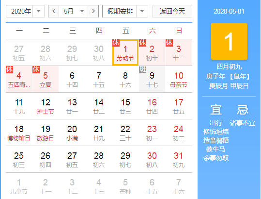 5月1日(星期五)至5日(星期二)放假調(diào)休,共5天。另外5月9日(星期六)上班。放假時(shí)間與國(guó)務(wù)院放假安排相同。