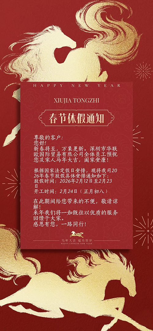 律回春漸,新元肇啟。值此 2026 丙午馬年新春佳節(jié)來臨之際,深圳市華聯(lián)歐國際貿(mào)易有限公司向您致以最誠摯的節(jié)日問候和衷心的感謝!
