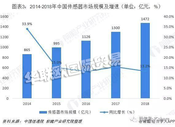 麥肯錫報(bào)告指出,到2025年,物聯(lián)網(wǎng)帶來(lái)的經(jīng)濟(jì)效益將在2.7萬(wàn)億到6.2萬(wàn)億美元之間,其中傳感器作為物聯(lián)網(wǎng)技術(shù)最重要的數(shù)據(jù)采集入口,將迎來(lái)廣闊的發(fā)展空間。據(jù)中國(guó)信通院數(shù)據(jù)顯示,近年來(lái)中國(guó)傳感器市場(chǎng)規(guī)模保持較快增長(zhǎng),2018年達(dá)到1472億元,同比增長(zhǎng)13.2%,近5年均保持兩位數(shù)的增長(zhǎng)率。