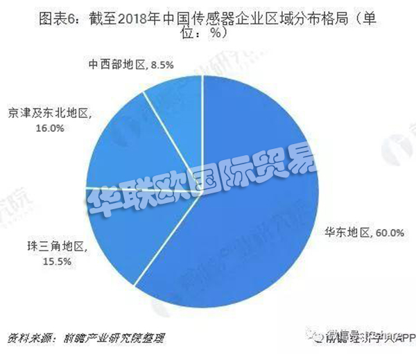 從企業(yè)分布來(lái)看,傳感器企業(yè)主要分布在華東地區(qū)、京津及東北地區(qū)、珠三角地區(qū)、中西部地區(qū)四大產(chǎn)業(yè)聚集區(qū)。其中,華東地區(qū)傳感器企業(yè)數(shù)量最多,約占全國(guó)企業(yè)總數(shù)的60%,珠三角地區(qū)約占15.5%,京津及東北地區(qū)約占16%,中西部地區(qū)約占8.5%。此外,傳感器產(chǎn)業(yè)伴隨著物聯(lián)網(wǎng)的興起,在其它區(qū)域,如陜西、四川和山東等地也逐步發(fā)展起來(lái)。