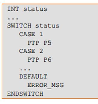 對帶有名稱”狀態(tài)”的整數(shù)變量(Integer),首先要檢查其值.如果變量的值為1,則執(zhí)行案例1(CASE1):機器人運動到點5.如果變量的值為2.則執(zhí)行案例2(CASE2):德國KUKA機器人運動到點P6.如果變量的值未在任何案例中列出(在該例中為1和2以外的值),則將執(zhí)行默認(rèn)分支:故障信息.