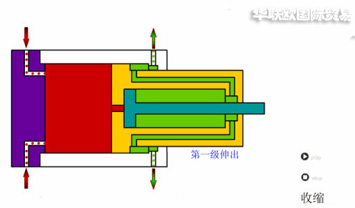 當(dāng)壓力油從無桿腔進(jìn)入時,活塞有效面積最大的缸筒開始伸出,當(dāng)行至終點時,活塞有效面積次之的缸筒開始伸出。伸縮式液壓伸出的順序是由大到小依次伸出,可獲得很長的工作行程,外伸缸筒有效面積越小,伸出速度越快。因此,伸出速度有慢變快,相應(yīng)的液壓推力由大變小;這種推力、速度的變化規(guī)律,正適合各種自動裝卸機(jī)械對推力和速度的要求。而縮回的順序一般是由小到大依次縮回,縮回時的軸向長度較短,占用空間較小,結(jié)構(gòu)緊湊。常用于工程機(jī)械和其他行走機(jī)械,如起重機(jī)、翻斗汽車等的液壓系統(tǒng)中。