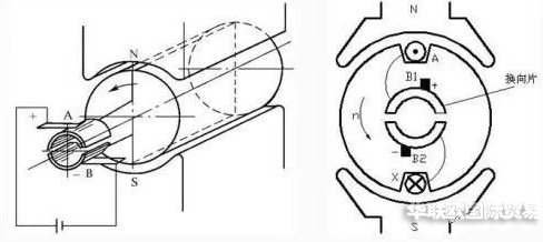 一臺直流電機原則上既可以作為電動機運行,也可以作為發(fā)電機運行,這種原理在電機理論中稱為可逆原理。當原動機驅動電樞繞組在主磁極N、S之間旋轉時,電樞繞組上感生出電動勢,經(jīng)電刷、換向器裝置整流為直流后,引向外部負載(或電網(wǎng)),對外供電,此時電機作直流發(fā)電機運行。如用外部直流電源,經(jīng)電刷換向器裝置將直流電流引向電樞繞組,則此電流與主磁極N.S.產(chǎn)生的磁場互相作用,產(chǎn)生轉矩,驅動轉子與連接于其上的機械負載工作,此時電機作直流電動機運行。