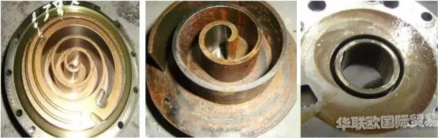 解剖表現(xiàn):機構(gòu)表面輕則鍍銅,重則生銹。(渦盤間隙和滾動活塞與缸蓋、氣缸內(nèi)壁間隙約10~20um,生銹、鍍銅導(dǎo)致間隙減小,摩擦增大。)