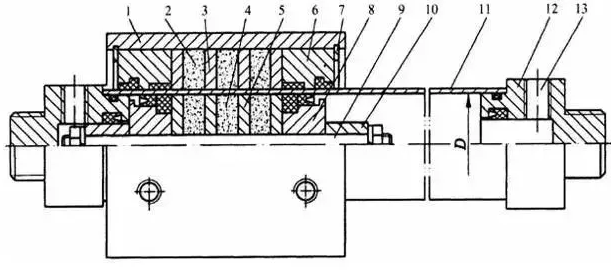 1-套筒,2-外磁環(huán),3-外磁導板,4-內磁環(huán),5-內磁導板,6-壓蓋,7-卡環(huán),8-活塞,9-活塞軸,10-緩沖柱塞,11-氣缸筒,12-端蓋,13-進、排氣口