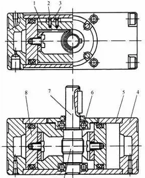1-齒條組件,2-彈簧柱銷,3-滑塊,4-端蓋,5-缸體,6-軸承,7-軸,8-活塞,9-齒輪