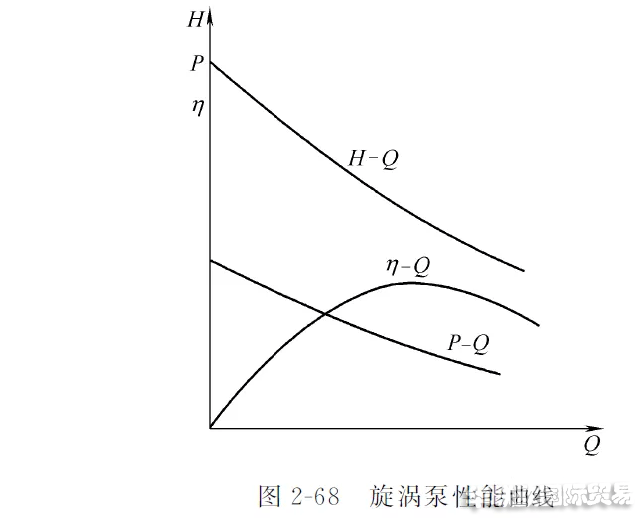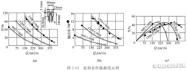 而當流量越小,則液體在葉輪內(nèi)的圓周速度和在環(huán)形流道內(nèi)的圓周速度相差越大,離心力相差也越大,縱向旋渦也隨之變大,壓頭也越高。圖2-68和圖2-69為旋渦泵性能曲線及其實例。由兩圖可見,流量減小時,壓頭就增加。