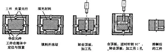 RL&SM 通用夾具系統(tǒng)采用規(guī)范化的板塊結(jié)構(gòu),構(gòu)成可拆卸的RL&SM 箱體,作為通用夾具系統(tǒng)在機(jī)床上快速尋位的基準(zhǔn)和記憶工件初始安裝信息的實(shí)體模型;箱體的各個(gè)板塊上裝有可便利調(diào)節(jié)的工件尋位元件,其固定后的實(shí)際位置通過(guò)測(cè)量獲得,并由數(shù)據(jù)采集系統(tǒng)送入信息處理系統(tǒng);工件通過(guò)尋位元件確定其在箱體中的初始位置,預(yù)緊后注入低熔點(diǎn)合金凝固形成工件的初始安裝姿態(tài),使工件、填料和箱體形成一個(gè)整體——工件夾具系統(tǒng)。