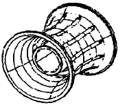 (2) 鞍形轉(zhuǎn)子:這是一個(gè)具有雙曲面外輪廓的高速回轉(zhuǎn)件(見(jiàn)圖10)。環(huán)壁薄、精度要求高,由于加工時(shí)易于產(chǎn)生變形,傳統(tǒng)生產(chǎn)中采用互為基準(zhǔn)、反復(fù)進(jìn)行工序轉(zhuǎn)換加工成形的方法,不僅加工效率低,而且需要各種專用工裝,采用柱形的RL&SM 通用夾具,通過(guò)填料增加了工件的剛性,避免了互為基準(zhǔn)反復(fù)加工的工藝過(guò)程,減少工序轉(zhuǎn)換次數(shù),提高切削效率,減少了專用工裝的花費(fèi),即設(shè)計(jì)、制造周期和成本等。
