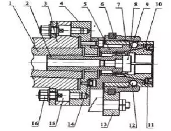 1-錐套 2-定位套 3-主軸 4-過(guò)渡盤 5-夾具體 6-瓦 7-夾緊套 8-活動(dòng)套 9-定位銷 10-彈簧夾頭 11-鎖緊檔圈 12-鋼球 13-撥叉 14-傳動(dòng)鏈 15-插銷螺栓 16-帶肩螺母