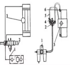 1-氣源處理三聯(lián)件 2-三位四通手動(dòng)轉(zhuǎn)閥 3-回轉(zhuǎn)氣缸 4-消聲器 5-尼龍管 6-管接頭