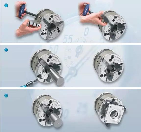 此卡盤具有快換爪功能,在保證重復定位精度的情況下,一分鐘快換所有卡爪,數(shù)秒鐘改變夾持直徑,卡爪的快換,有效降低了機床調(diào)整時間,工件加工時間得以延長。