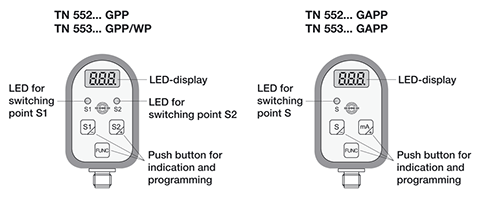 緊湊型號TN 552 GPP和TN 552/1 GPP有兩個獨立的可調(diào)節(jié)開關點。緊湊型號TN 552 GAPP和TN 552/1 GAPP具有一個獨立的可調(diào)節(jié)開關點和一個可擴展的4 ... 20 mA模擬輸出。