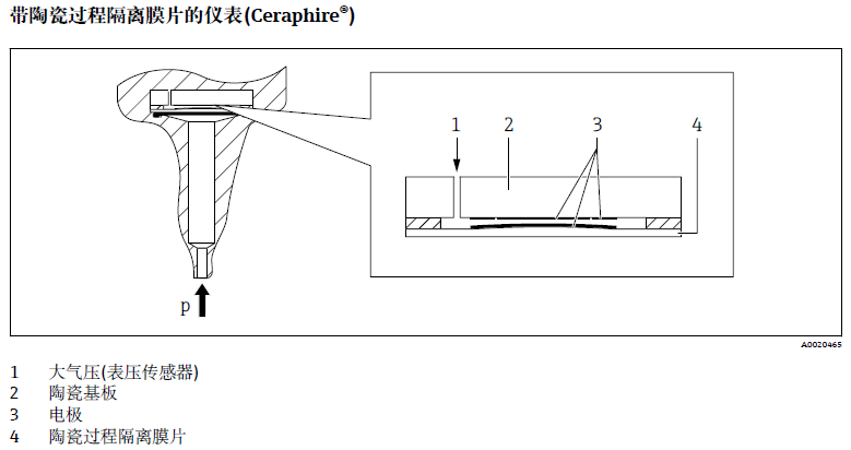 陶瓷傳感器是非充油傳感器,即過程壓力直接作用在堅固耐用的陶瓷過程隔離膜片上,導(dǎo)致膜片發(fā)生形變。陶瓷基板電極和過程隔離膜片電極可以檢測與壓力成比例關(guān)系的電容變化量。陶瓷過程隔離膜片的厚度確定了測量范圍。