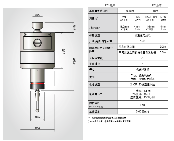 MARPOSS無線傳輸測頭WRP60測頭適用于大型機床和立式車床。結(jié)實的本體和超長的電池壽命相結(jié)合 它可以配合馬波斯T25和TT25測頭使用,加長桿最長到一米。 可與WRI集成接收器接口一起使用。WRP60屬于無線電傳輸觸發(fā)式測頭,利用模塊化設計,可以滿足用戶的任何需求。適用于MARPOSS T25、TT25及TT30觸發(fā)式測頭的各種場合,并與WRI接收器兼容。